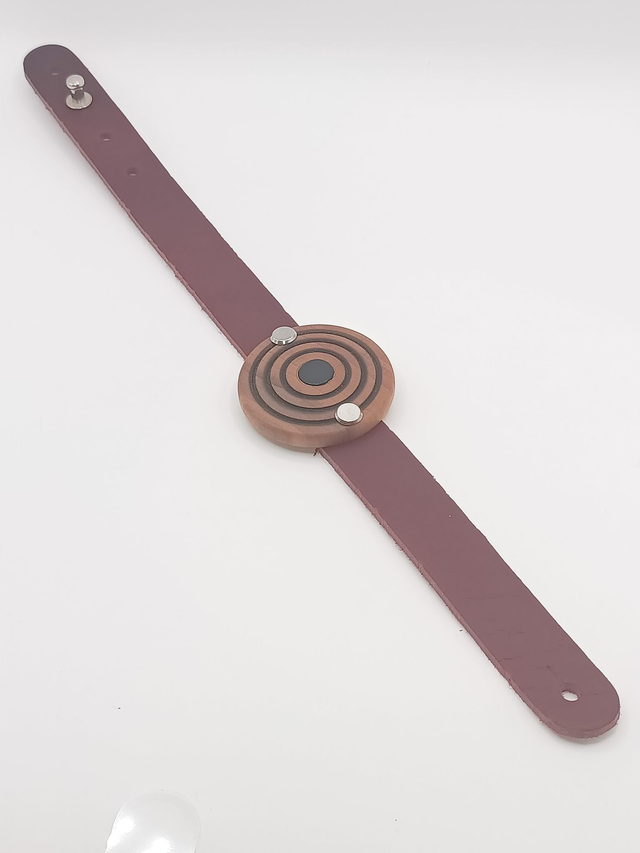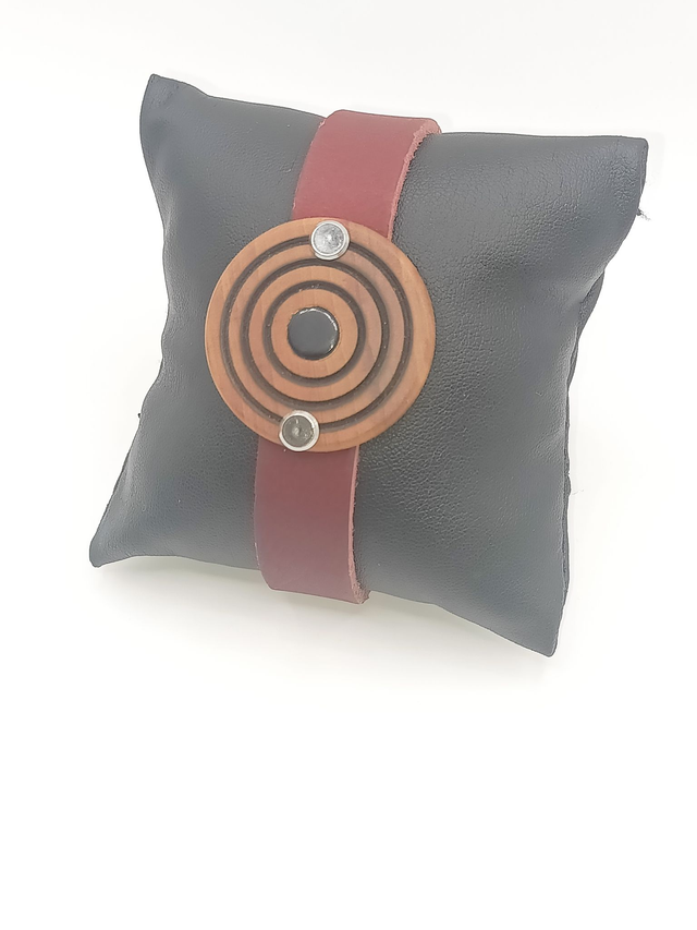 Découvrez ce bracelet au design distinctif : le cuir plat rouge foncé de 15 mm met en valeur le médaillon en bois de Péroba clair (trois lignes noires graphiques et onyx noir profond incrusté en son centre), solidement maintenu par des attaches en acier inoxydable. La fermeture se fait aisément grâce à un bouton de col en acier inoxydable. Réglable de 18 à 22 cm. Finition naturelle à l'huile de lin (du bois).