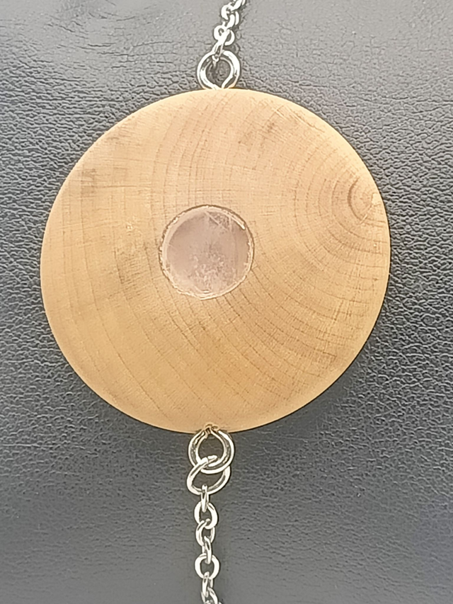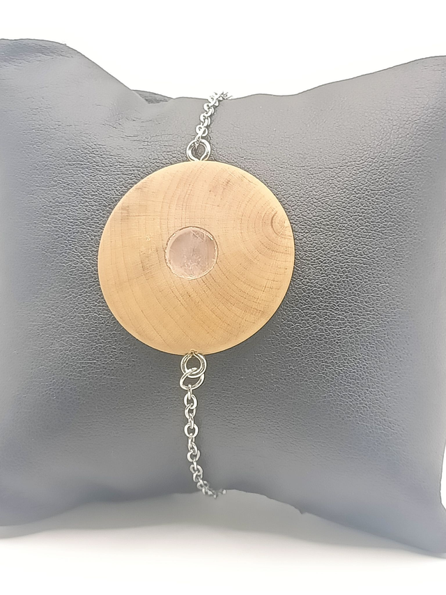 Élégant bracelet en bois de Buis à la surface lisse, orné en son centre d'une délicate pierre de Quartz Rose incrustée. Monté sur une fine chaînette en acier inoxydable 304. Réglable pour un tour de poignet de 18 à 21 cm. Finition naturelle à l'huile de lin.