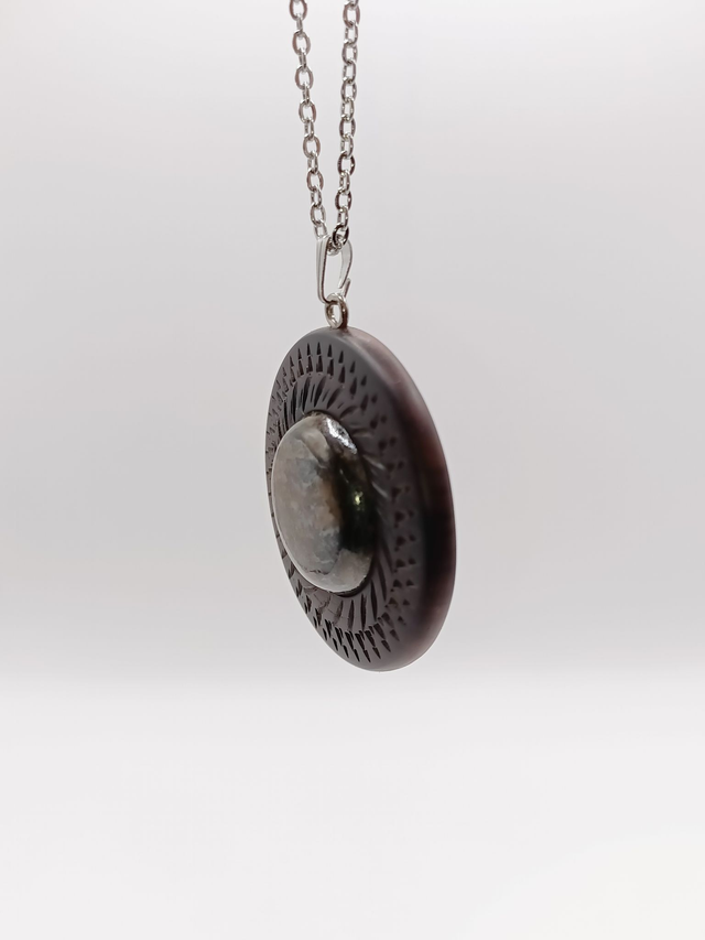 Collier unique avec un pendentif en bois de Palissandre Santo dont la surface est structurée d'une multitude de traits, offrant une texture particulière. En son centre repose une pierre de Bronzite bombée aux reflets métalliques chaleureux. Monté sur une chaîne en acier inoxydable d'une longueur de 50 cm. Finition naturelle à l'huile de lin.