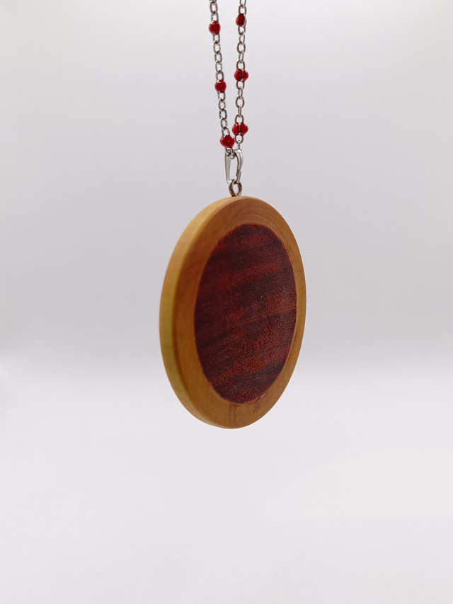 Collier unique avec un pendentif où le Buis clair est délicatement souligné d'un fin liseré en Padouk rougeoyant, encadrant une grande et fascinante pierre de Jaspe Mokaïte aux couleurs de la terre. Monté sur une chaîne en acier inoxydable 304 d'une longueur de 50 cm, agrémentée de petites perles en époxy rouges. Finition naturelle à l'huile de lin.