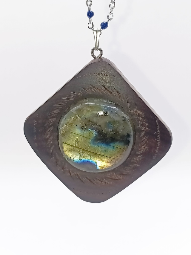 Un carré de bois révélant les aurores boréales : ce collier présente un pendentif en Palo Santo à la surface structurée, portant une Labradorite aux reflets changeants et enchanteurs. La chaîne en acier inoxydable 304 d'une longueur de 50 cm, ornée de perles en époxy bleu foncé, complète cette pièce mystique. Finition naturelle à l'huile de lin.