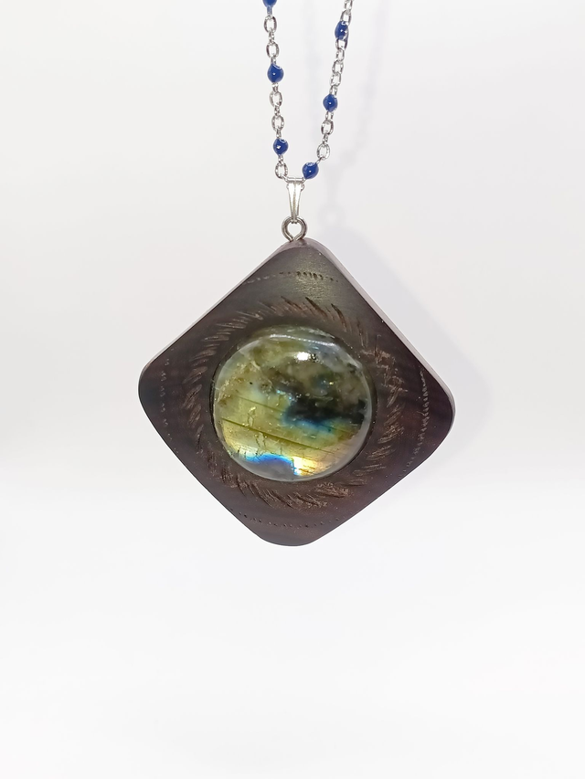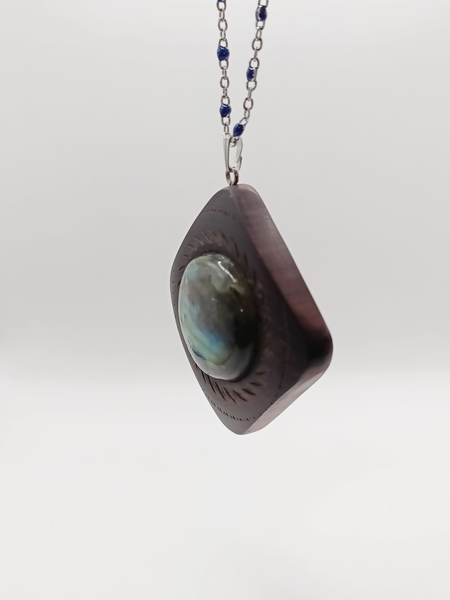 Matériaux : Bois de Palo Santo, pierre Labradorite, acier inoxydable 304, époxy bleu, huile de lin