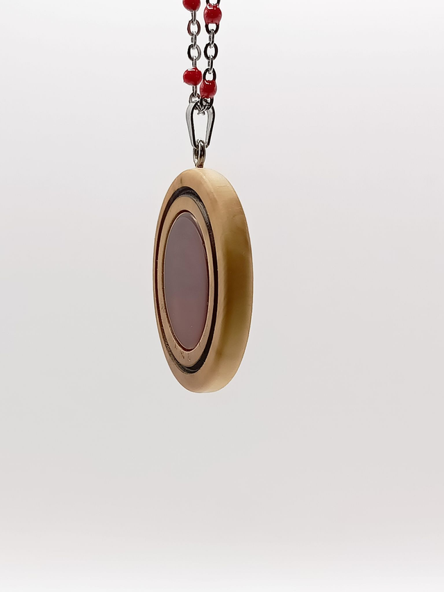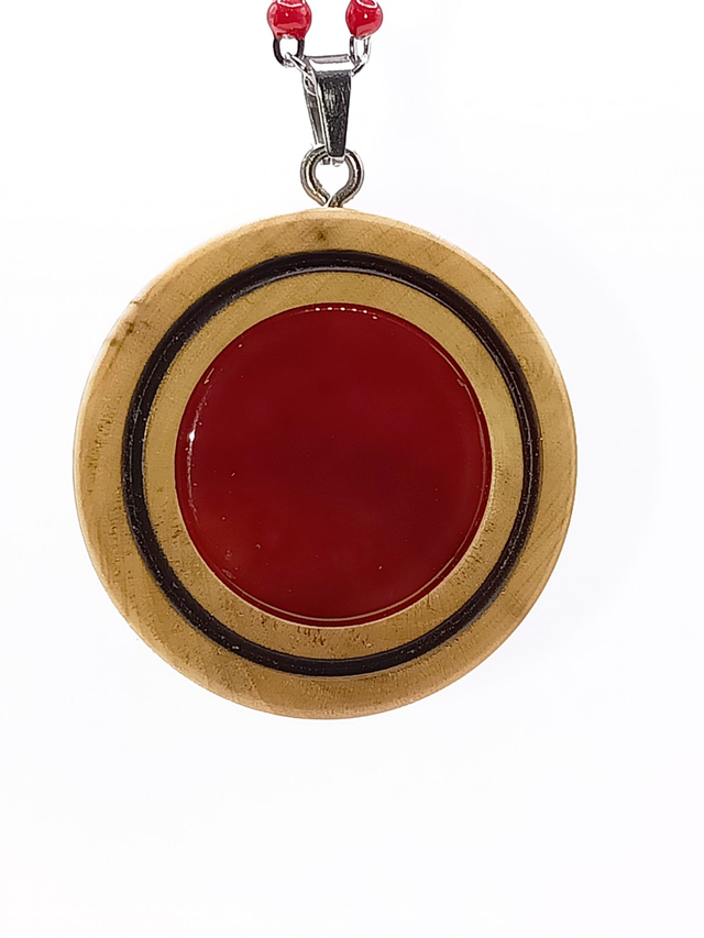 Un cœur de feu serti dans la douceur du Buis, marqué d'un anneau d'ombre : ce collier présente un pendentif où une grande Cornaline rayonne, encerclée d'une trace noire unique obtenue par friction. La finition à l'huile de lin met en valeur la beauté naturelle du bois. La chaîne en acier inoxydable d'une longueur de 50 cm est ornée de perles en époxy rouges, écho de la pierre. Finition naturelle à l'huile de lin.