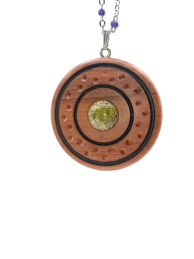 Collier unique avec un pendentif en bois de Péroba, orné en son centre d'une pierre d'Unakite bombée. Deux cercles noirs distinctifs, réalisés par friction au tour à bois, encadrent des motifs ronds délicats sur le bois. Monté sur une chaîne en acier inoxydable 304 d'une longueur de 50 cm, agrémentée de perles en époxy violettes. Finition naturelle à l'huile de lin.