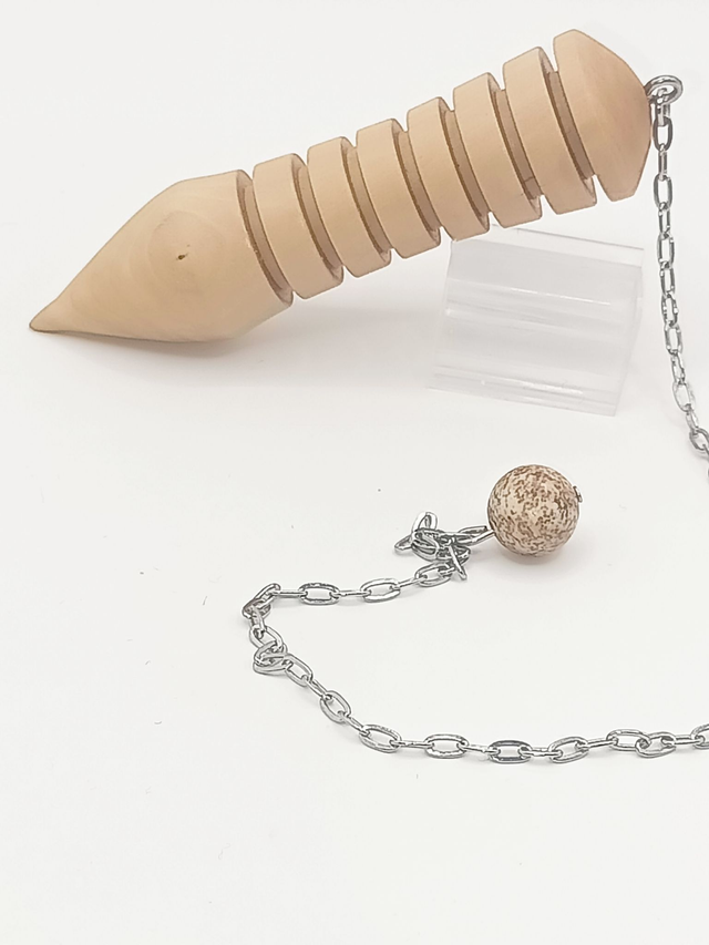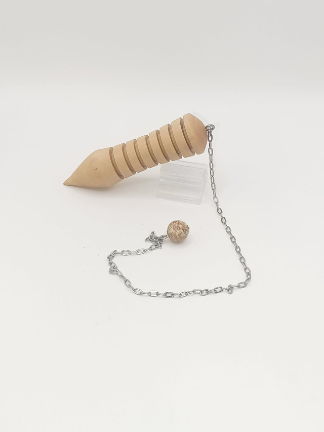 Explorez votre intuition avec ce pendule en bois de Buis. Sa chaîne en acier inoxydable se termine par une perle en Jaspe Paysage, dont les dessins organiques peuvent inspirer vos explorations. La finition seulement lustré révèle la beauté naturelle du bois.