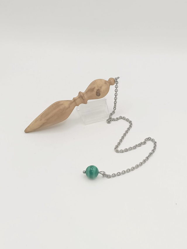 Pendule ésotérique en bois de Buis, finement tourné. Il est monté sur une chaîne en acier inoxydable de 20 cm. Une perle de Malachite de 8 mm aux motifs uniques est fixée à l'extrémité de la chaîne. Finition naturelle à l'huile de lin pour le bois.