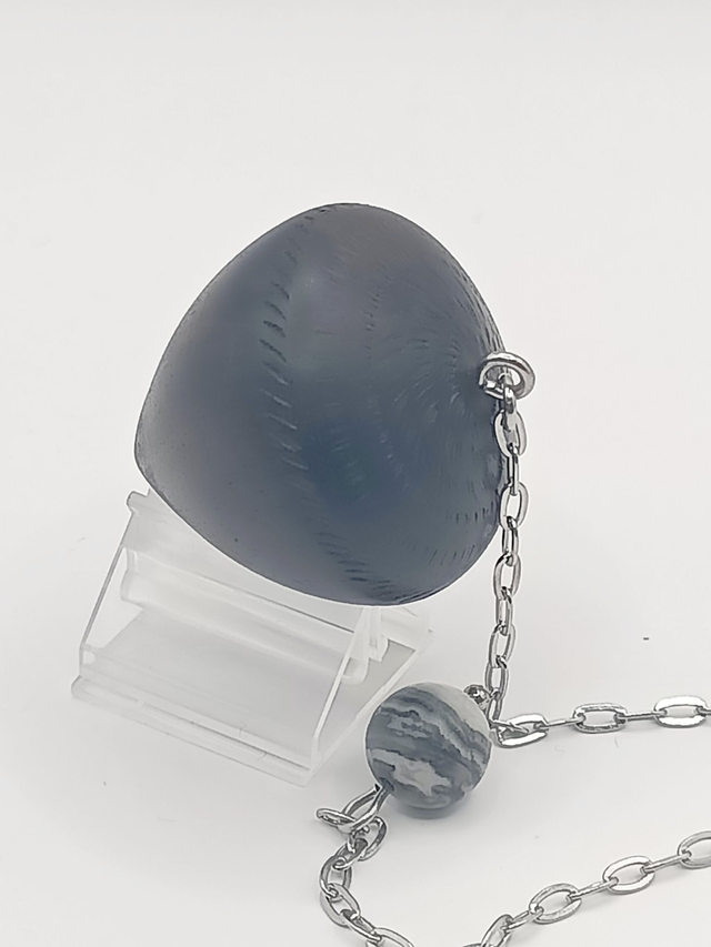 Pendule en bois d'Ebène aux tons profonds et élégants, monté sur une chaîne en acier inoxydable. Une perle en Jaspe Feuille Argent uniques est fixée à l'extrémité. Finition naturelle seulement lustré pour le bois.