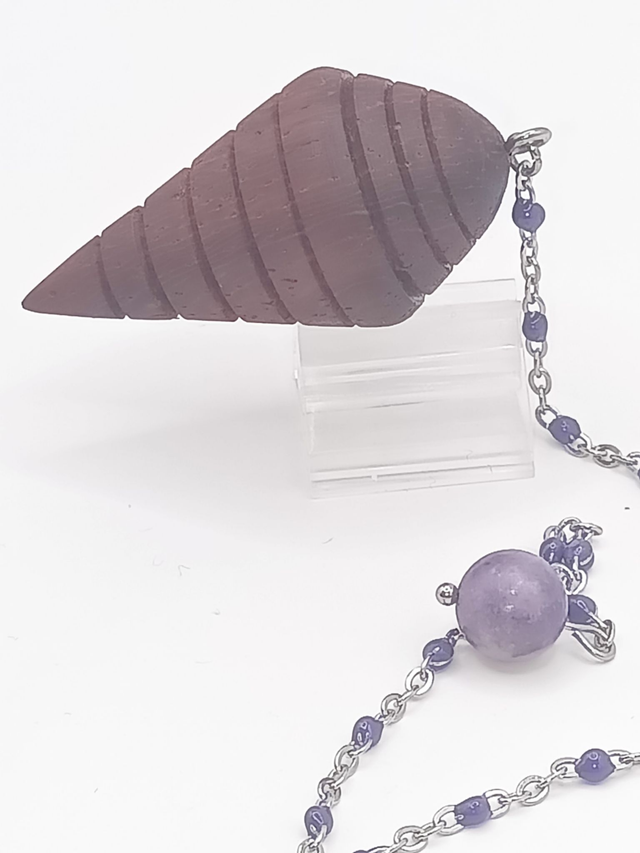 Pendule ésotérique en bois de Padouk aux chaleureux tons rouges, monté sur une chaîne en acier inoxydable agrémentée de perles en époxy violettes. Une perle de Lépidolite de 8 mm, aux nuances de lilas, est fixée à l'extrémité. Finition naturelle à l'huile de lin pour le bois.