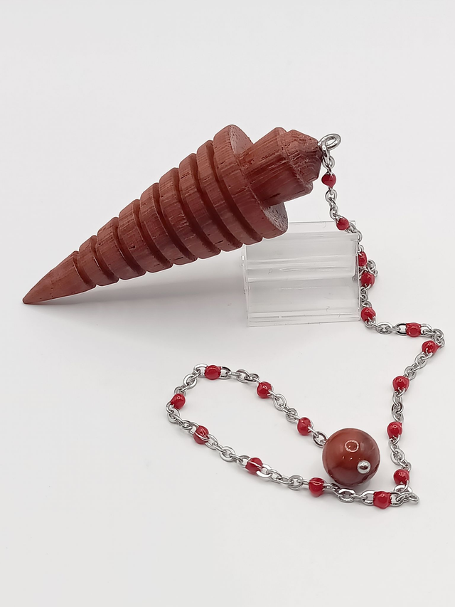 Ce pendule se distingue par l'éclat du bois de Padouk. Il est monté sur une chaîne en acier inoxydable, parsemée de petites perles en époxy rouge. À son extrémité, une perle de Jaspe Rouge complète cet ensemble. Le bois bénéficie d'une finition naturelle seulement lustré.
