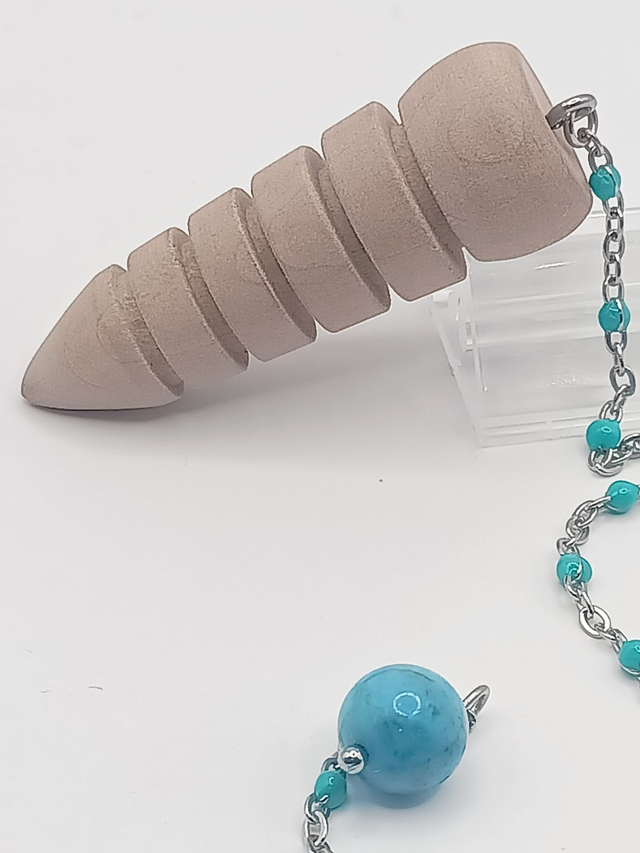 Ce pendule en bois de Poirier est monté sur une chaîne en acier inoxydable, ornée de petites perles en époxy bleu turquoise. À son extrémité, une perle d'Apatite, aux nuances bleues apaisantes, complète cet ensemble harmonieux. Le bois bénéficie d'une finition naturelle lustré.
