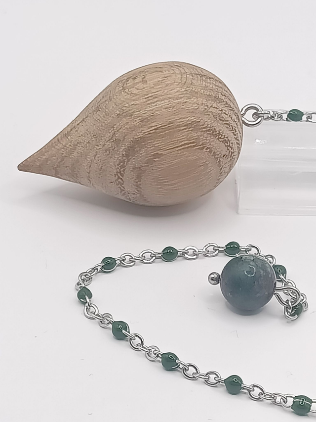 Pendule ésotérique en bois de Robinier aux tons clairs, monté sur une chaîne en acier inoxydable agrémentée de perles en époxy vertes. Une perle de Rubis sur Zoïsite est fixée à l'extrémité. Finition naturelle pour le bois.