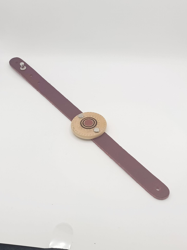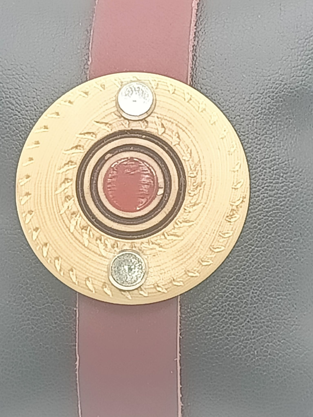 Découvrez ce bracelet au design original : le cuir plat rouge foncé de 15 mm met en valeur le médaillon en bois de Buis clair (deux cercles noirs sculpté, centre Agate rouge incrusté), solidement maintenu par des attaches en acier inoxydable. La fermeture se fait aisément grâce à un bouton de col en acier inoxydable. Réglable de 18 à 22 cm. Finition naturelle à l'huile de lin (du bois).