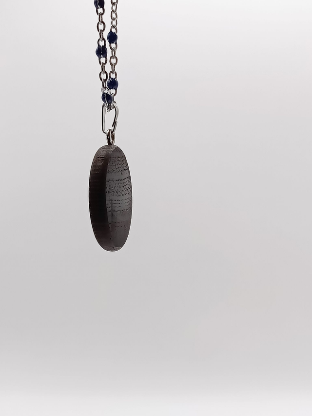 Collier élégant avec un pendentif en bois de Wengé aux tons profonds, orné en son centre d'une pierre d'Amazonite d'un bleu captivant, délicatement incrustée. La finition à l'huile de lin met en valeur la beauté naturelle du bois. La chaîne en acier inoxydable d'une longueur de 50 cm est agrémentée de perles en époxy bleu foncé assorties.