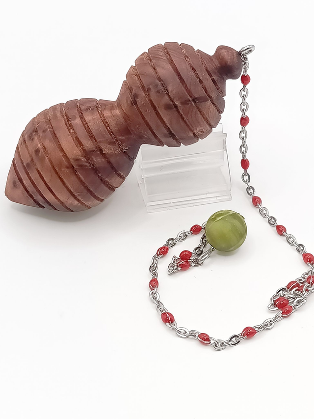Ce pendule est en Ronce de Thuya, offrant des motifs uniques. Il est monté sur une chaîne en acier inoxydable élégamment parsemée de petites perles en époxy rouge. À son extrémité, une perle de Jade, complète cet ensemble. Le bois bénéficie d'une finition naturelle à l'huile de lin.